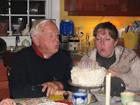 Dinner was great - the gouda-walnut biscotti was tremendous and will reappear at Christmas, the lasagne seemed to disappear at a good rate and the multi-layer chocolate cake was polished off with gusto. Ken loved his gifts - particularly impressed by his hat 'just like Jimmy's with FOUR lights on the brim. He will be able to land planes with it, we reckon. Earlier in the afternoon Ken had admired the Cape Breton scotch in the liquor store - pointing it out to me and speaking of an article he had just read about its' quality. Lo and behold, there was a gift bag from John and Cathy with that very scotch. Ken was tickled. And the solar lantern from Chantelle already has a place in the garden all staked out. The dogs found him a large stuffed Airedale and the Sullenberger book.